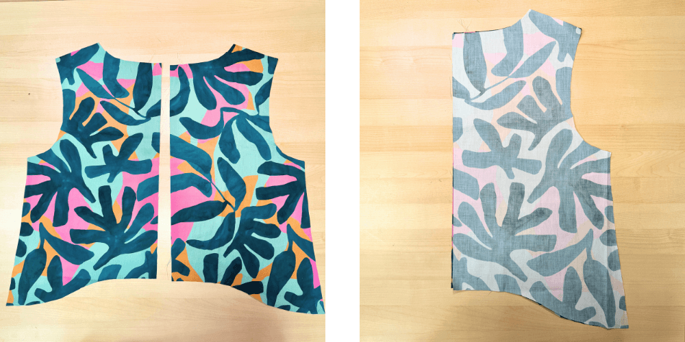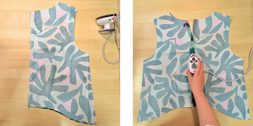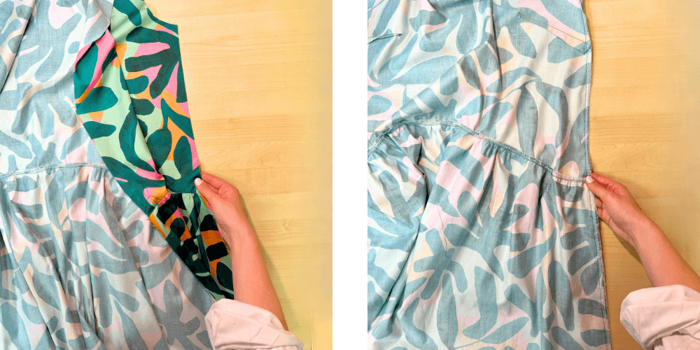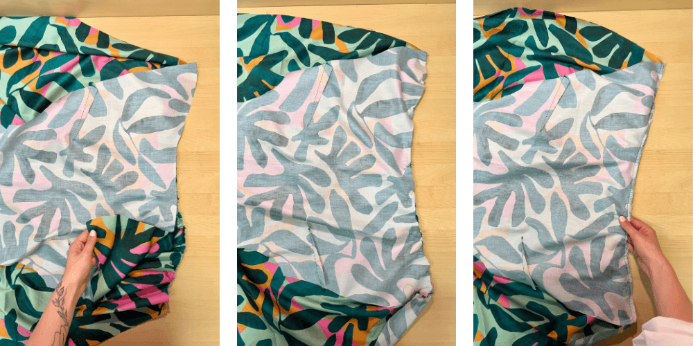 Sprednji del razpremo in razlikamo. Šiv naj bo zalikan proti zgornjemu delu. Ob robu naredimo še ozek nadšiv, da bodo naborki lepše stali. Enak postopek ponovimo tudi na hrbtnem delu.