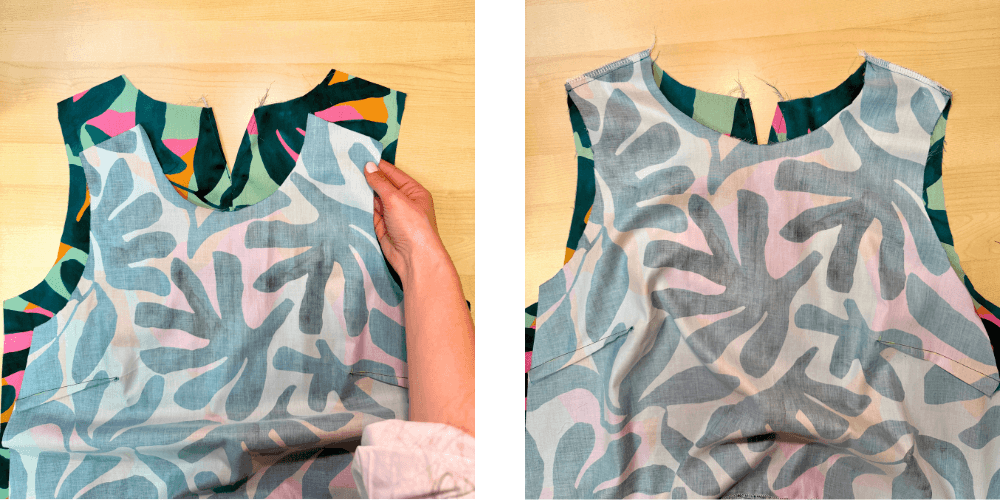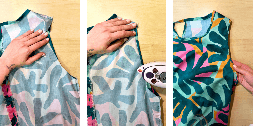 Sprednji in zadnji del zložimo rame na rame, lice na lice, in šivamo 1 cm od roba. Šiv nato obzankamo.
