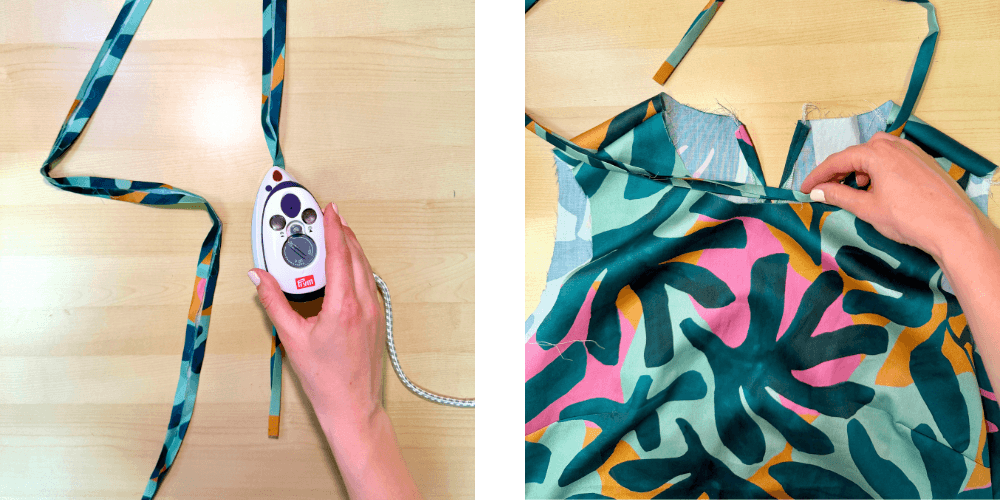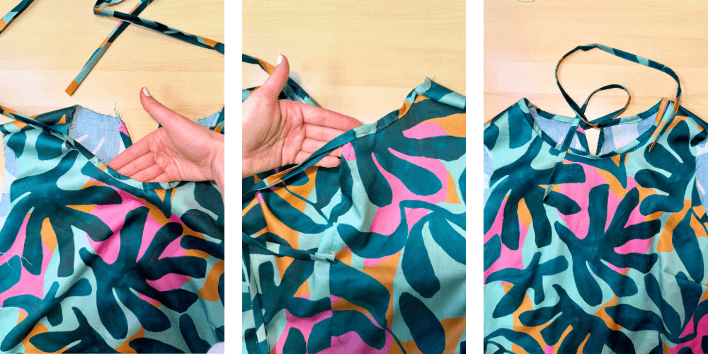 Trak zložimo dvakrat proti sredini in nato še enkrat na polovico ter ga dobro zalikamo. Nato ga namestimo na vratni izrez in pripnemo z bucikami. Konca traku naj bosta na obeh straneh enake dolžine. Šivamo ozko ob robu, do konca traku.