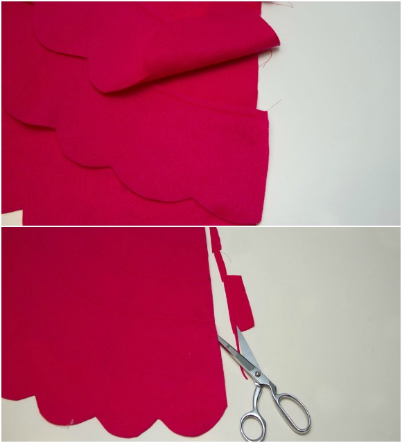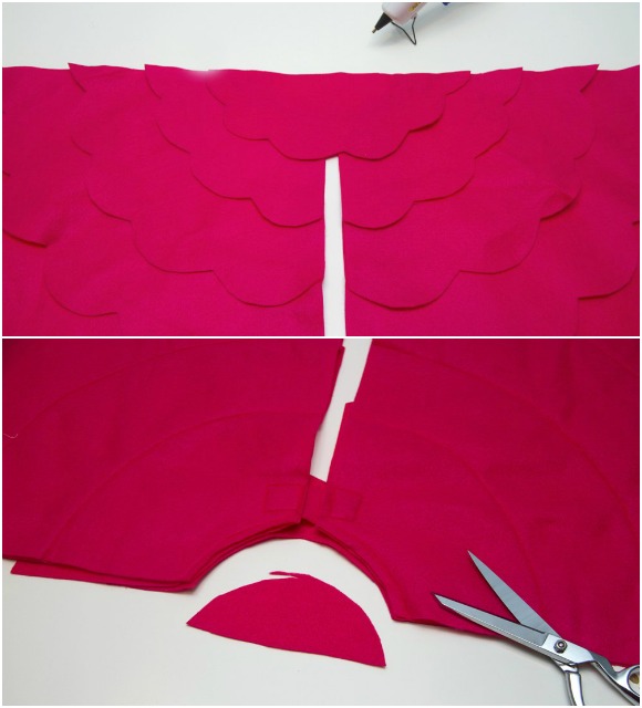 Vzemite kos filca, dolžine izmerjene od ene roke do druge ter izrišite polkrog. Kroj prerežite še po polovici, tako da dobite dve četrtini kroga. Kjer imate vratni izrez na vrhu, izrežite še manjši polkrog za vrat.