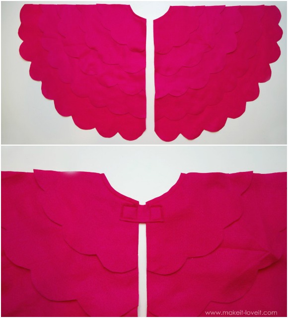 Izrežite še zadnji polkrog in ga namestite, da prekrije pravokotnik, ki drži krila skupaj. Na hrbtni strani odrežete še enkrat vratno okroglino, kot je prikazano na sliki.