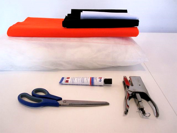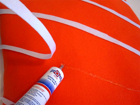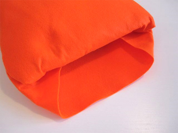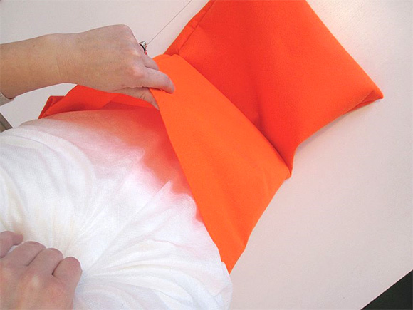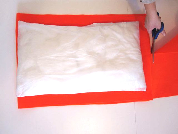 Oranžen filc prepognemo na pol in izrežemo velikost blazine + 3cm na vsaki strani.