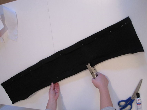 Z lepilom za tekstil nalepimo trakove in jih cca 5 min pustimo, da se sušijo. Preostanek trakov nalepimo še na hrbtni strani oziroma višek odrežemo.