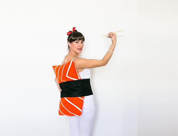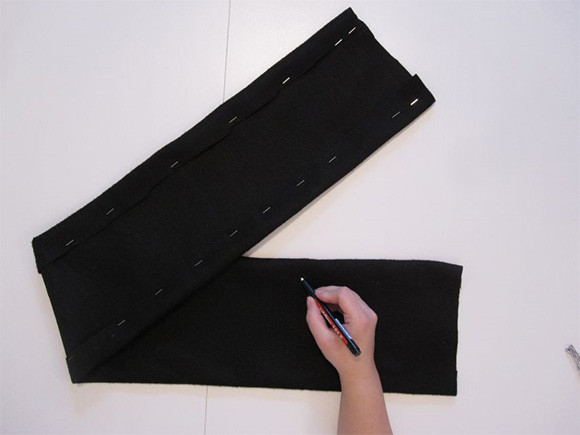 Iz črnega filca odrežemo 25cm širok in za svoj obseg pasu + 20 cm dolg pas. Vsako stran s spenjačem obrobimo v razmaku 5cm.