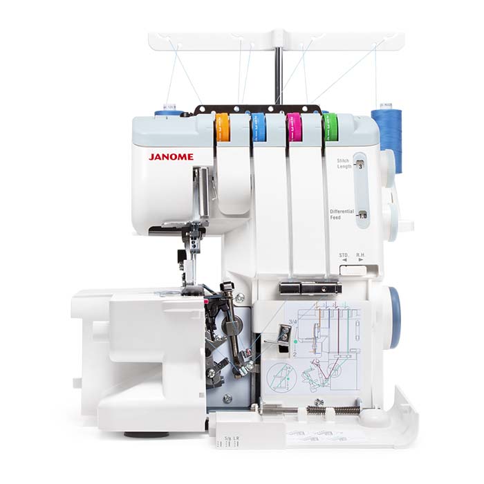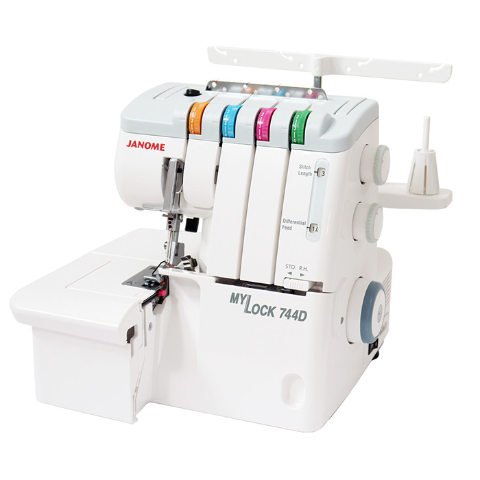 Vdevanje sukanca je enostavno, saj stroj vključuje barvno shemo za hitro in pravilno vdevanje ter samodejno vdevanje v spodnji lovilec. Janome 744D omogoča enostavno spreminjanje šiva iz navadnega overlock šiva v rolirani rob (ozek, gosti volanček širok 1,5 mm) brez potrebe po menjavi vbodne plošče ali tačke, kar poenostavi uporabo.