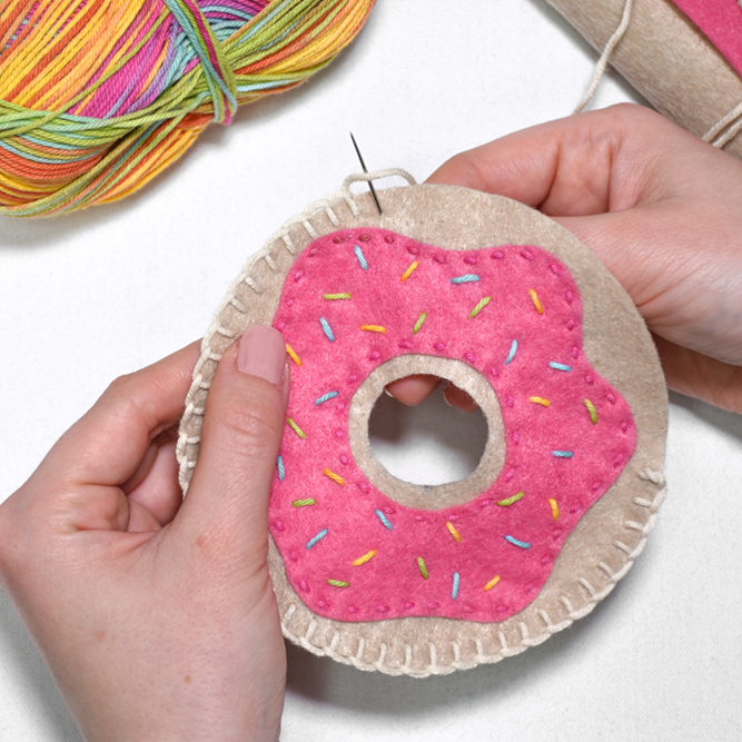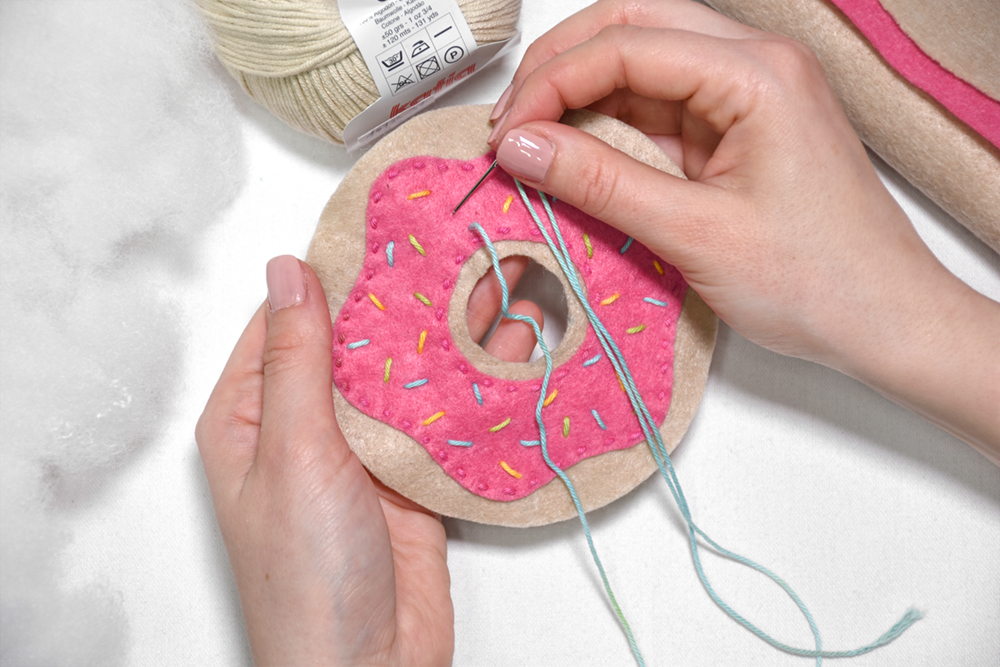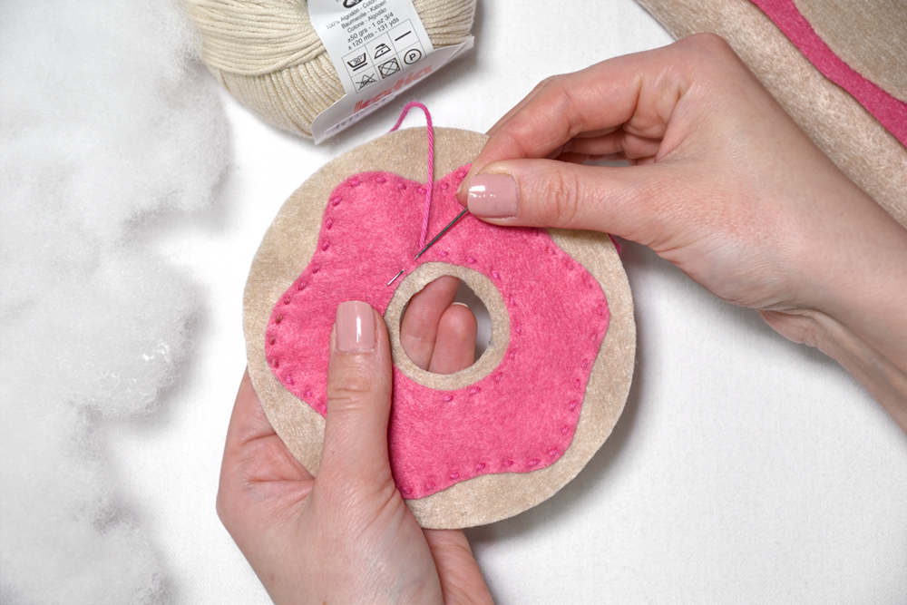 Z zančnim vbodom zgornjemu delu krofa pridružimo še spodnjega. Najprej ju združimo na zunanjem robu.
