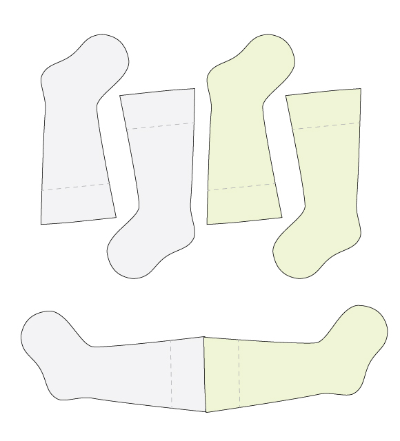 Izrezane krojne dele položite tako kot kažeta slika in skica zgoraj - torej enega, v tem primeru sivega in enega zelenega in isto ponovite še na drugem paru. Nato položite oba po robu sešita krojna dela skupaj lice na lice, ter oba obšijete. Obšijete, tako da na eni strani vzorca, ki bo notranji, pustite odprtino, veliko približno 5 cm. Čez to luknjico boste namreč obrnili celotno nogavičko naokoli na pravo stran.