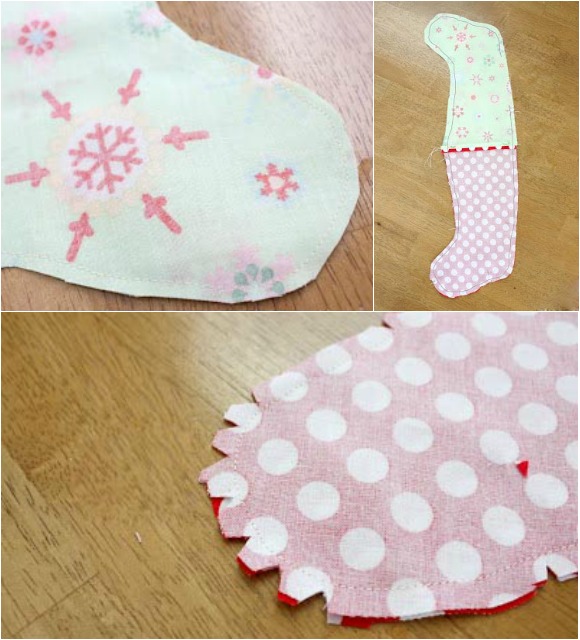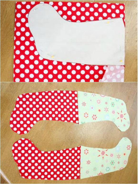 Izrežite krojni del in ga postavite na blago. Izrezati morate 4 kose nogavičk, v tem primeru dve v rdečem in dve v zelenem odtenku. Obrežite ob kroju, saj je dodatek za šiv že upoštevan.