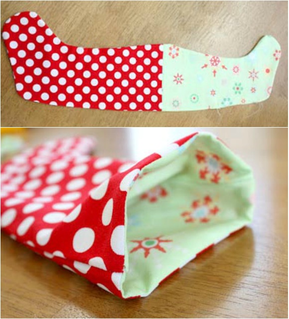 V tem primeru je odprtina za obračanje ostala na zeleni strani. Tako morate na pravi strani zarobiti še to luknjico. Obrnjeno nogavičko še na vrhu zavihajte in po želji dekorirajte z aplikacijami, in drugimi dodatki.