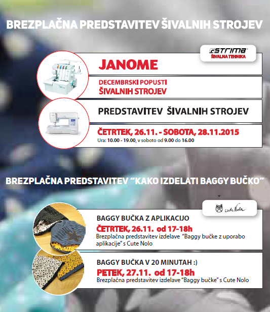 V tem času boste lahko neomejeno preizkušali vse šivalne stroje vrhunskega japonskega proizvajalca strojev Janome. V pomoč vam bodo tehniki podjetja Strima, ki vam bodo tudi z veseljem predstavili novosti pri šivalnih strojih, stroje overlock in coverlock, vezilne stroje in uporabne pripomočke.