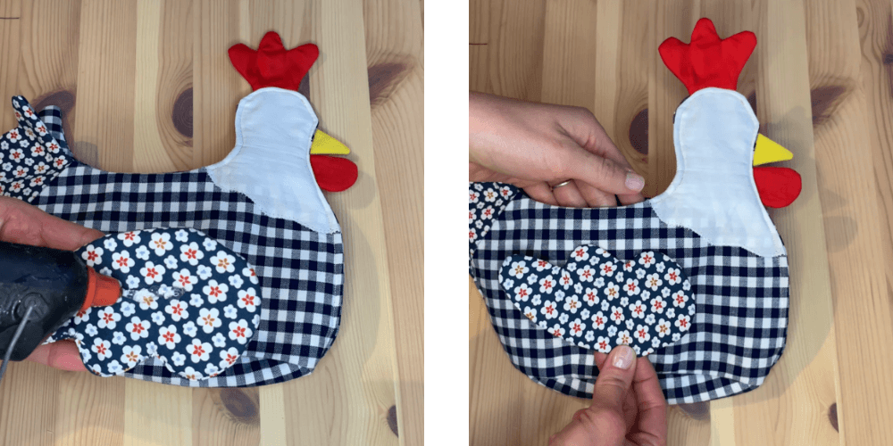 Peruti prilepimo ali ročno prišijemo na kokoško.
