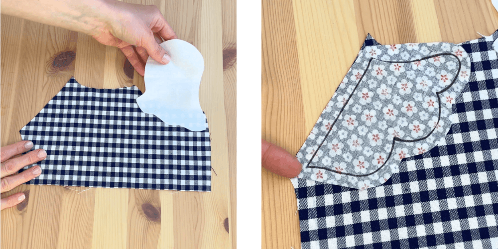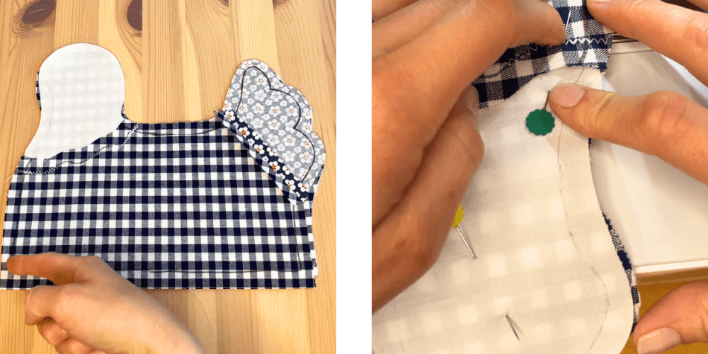 Na sprednji del dodamo kos za glavo in rep v drugi barvi ter prišijemo 1 cm od roba.