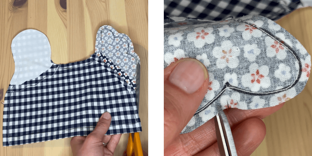 Ostanek roba obrežemo, na zaobljenih delih pa naredimo zareze, da se bo blago lepše obrnilo.