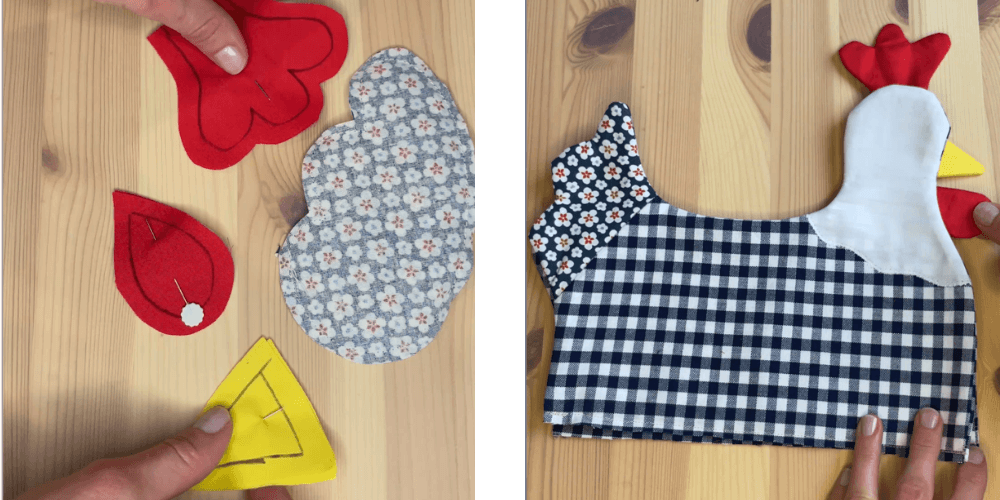 Spodnji del sestavimo iz medvloge in dveh plasti blaga ter obšijemo. Kokoško obrnemo in spodnji del prišijemo nanjo.