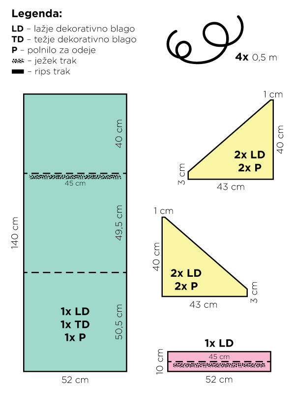 Blago razrežite s pomočjo spodnjega diagrama. V mere je vključen 1 cm dodatek za šivanje.