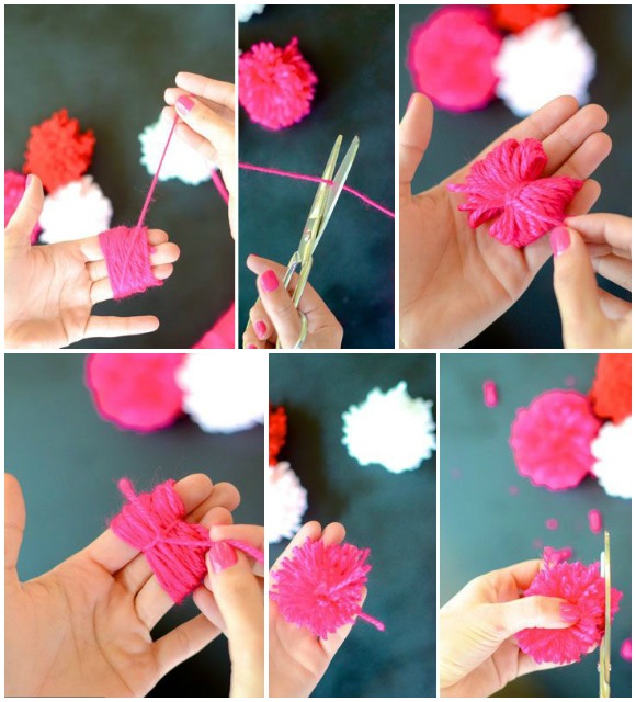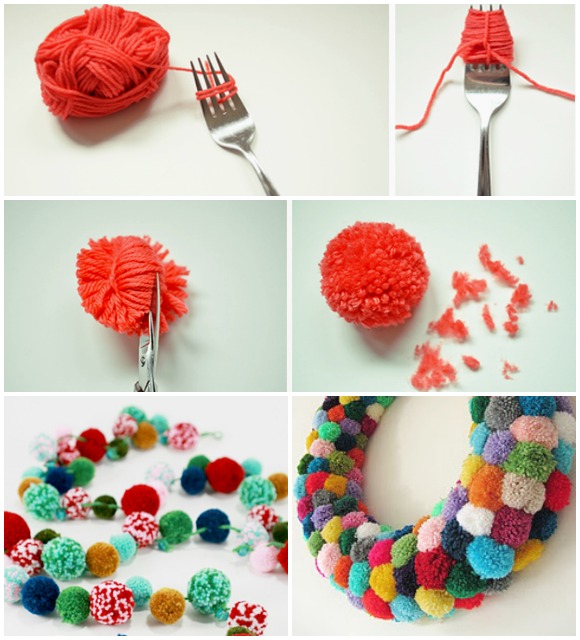 Pom-pom cofke lahko tudi zaporedoma navežete na vrvico, kot kaže zgornja slika in s tem okrasite jelko, ali popestrite kakšno steno.