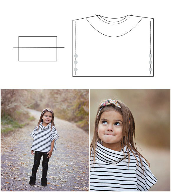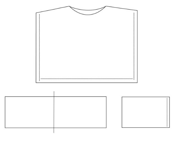Kroji so enostavni, trije pravokotniki, dvema izrežete le vratni izrez ter postrani izrez za ramensko linijo. Širino pravokotnika za vaš sprednji in zadnji del pomerite razdaljo med komolci, na primeru je približno 60 – 70 cm.