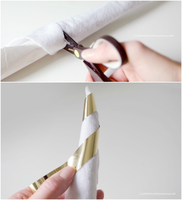 Iz tršega papirja naredite rog v obliki ostrega stožca, ki ga nato oblečete v filc ter z lepilom fiksirate.