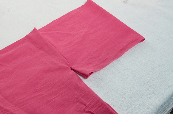 Najprej izrežite dva pravokotnika višine, ki jo izmerite. To je razdalja med vašimi rameni ter višino pasu oziroma modela. V večini primerov je material širine 140 cm, če ga damo na polovico, dobimo 70 cm, kar je ravno prav za našo širino pravokotnika.