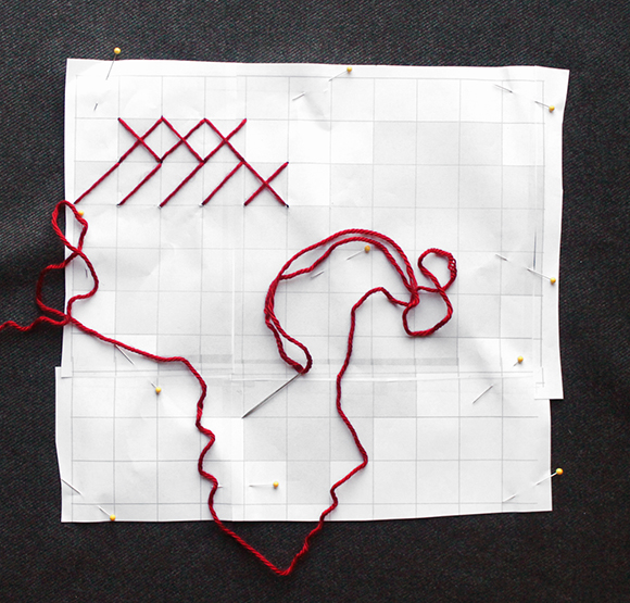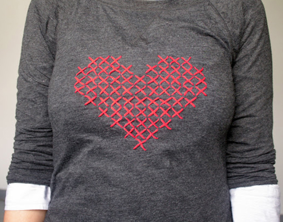 Položite list papirja z vzorcem na mesto, kjer želite imeti vezeno srce. Z rdečo ali katerokoli drugo barvo začnite čez list papirja in blago delati križce.