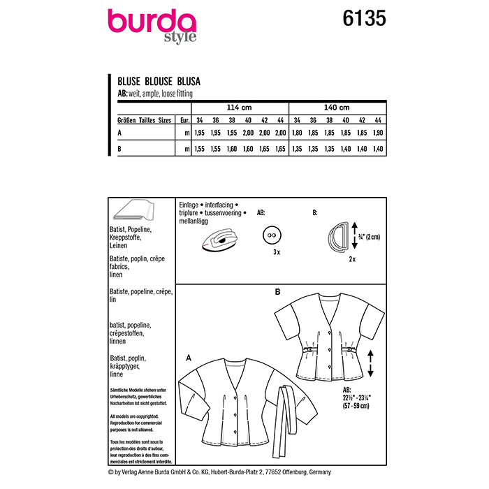 Kroj za žensko bluzo na V izrez, zapenjanje na gumbe.